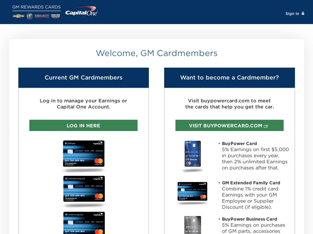 We would like to show you a description here but the site won't allow us. You can earn 5% back on purchases of parts, service, and accessories made at authorized gm dealers. Is the issuer of the buypower card, the buypower business card, the gm card, the gm flexible earnings card and the gm extended family card. All gm business card holders should have received new cards in the mail by march of 2015. The buypower card from capital one® doesn't make you choose a discount or a reward redemption.